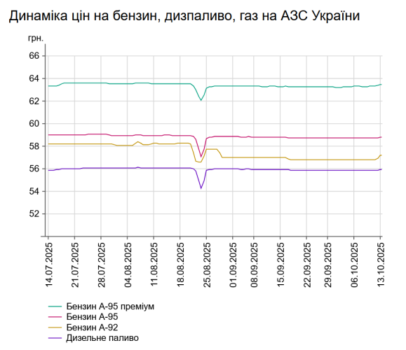 У понеділок, 13 жовтня, середня ціна на бензин марки А-95 зросла на 8 коп. до 58,78 грн/л, на дизельне пальне – на 8 коп. до 55,93 грн/л.