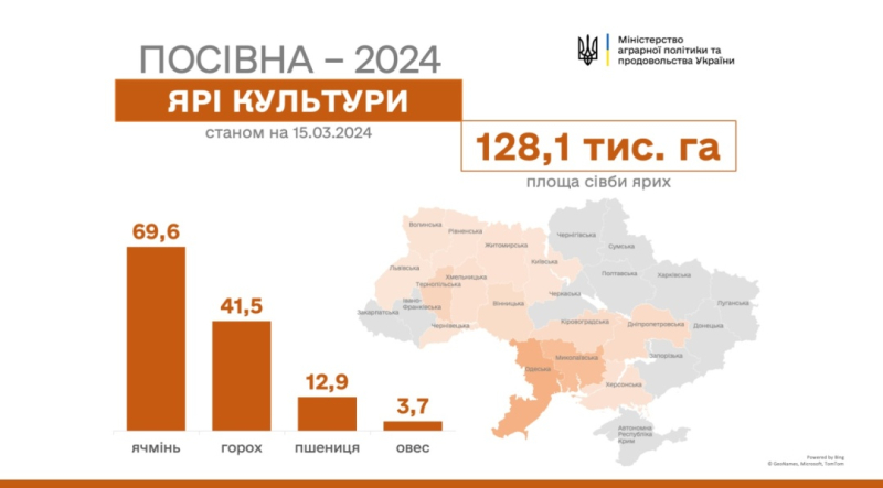 "Станом на 14 березня в Україні засіяно 128,1 тис. га зернових та зернобобових культур. З них – 12,9 тис. га пшениці, 69,6 тис. га ячменю, 41,5 тис. га гороху та 3,7 тис. га вівса.