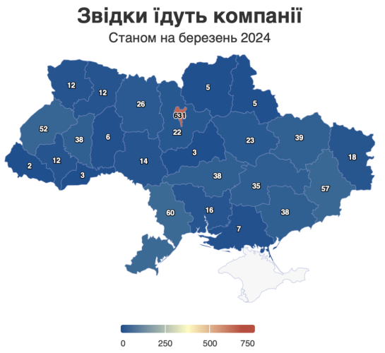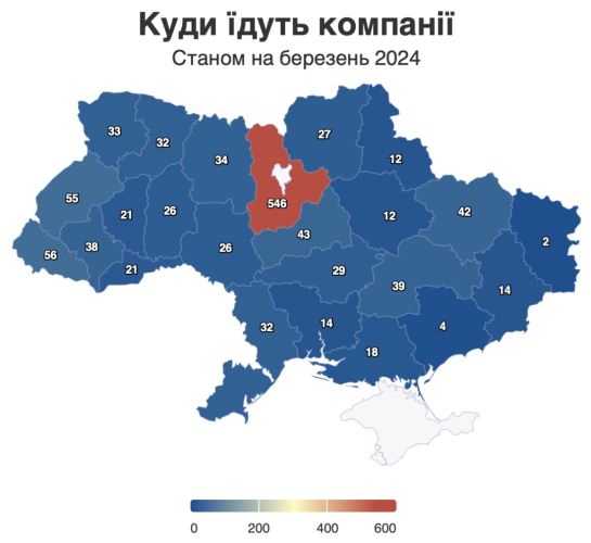 За даними аналітиків, переважно бізнес для переїзду з великих міст обирає Київську область — 546 переїздів. Це майже кожна друга релокація бізнесу від початку повномасштабної війни.