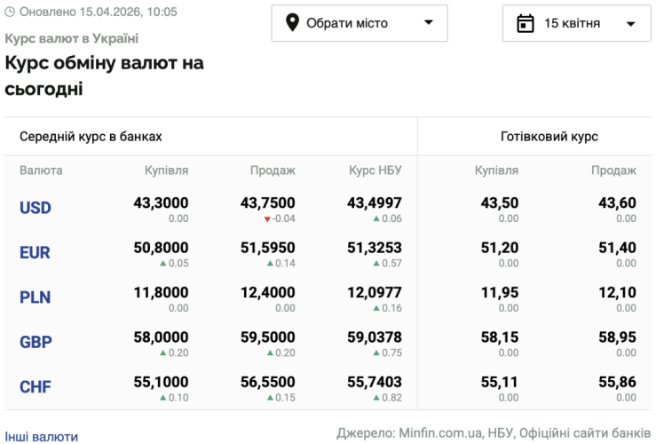 - 1 долар США – 43,49 грн (43,43 грн станом на 14 квітня);