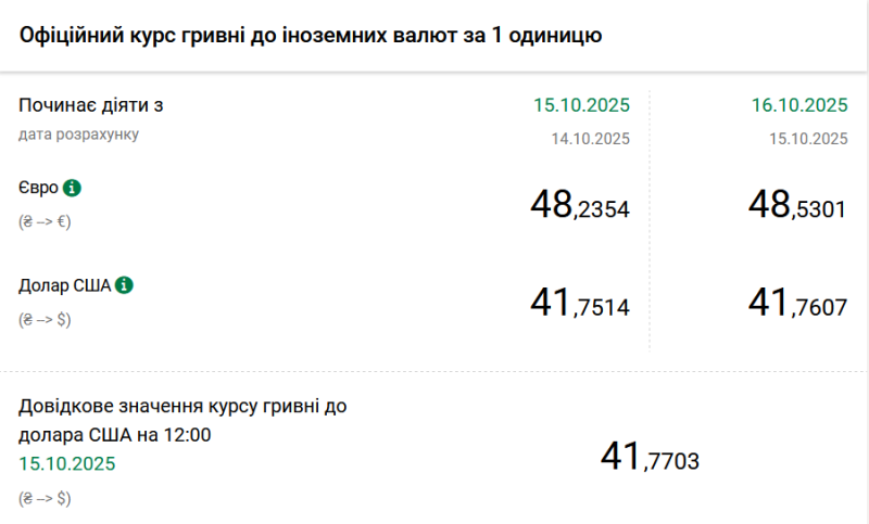 1 долар США – 41,76 грн (41,75 грн станом на 15 жовтня);