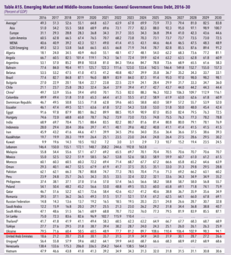 Фонд прогнозує початок зниження цього показника з 2027 року (до 106,4%). Відповідно, передбачається подальше зменшення до 102,9% в 2028 році, 98,3% у 2029-му й 94,1% у 2030 році.