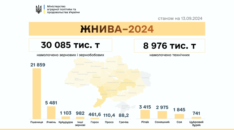 Українські аграрії станом на 13 вересня 2024 року намолотили 39,06 млн тонн нового врожаю, який зібраний на площі 10,9 млн га.
