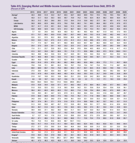 Так, у розділі щодо країн з ринком, який розвивається, а також країн із середнім рівнем доходу зазначається, що держборг України в 2024 році сягне 94%. Цей прогноз є дещо меншим порівняно з жовтневим випуском «Фінансового монітору» – тоді очікувалося, що держборг зросте до 98,6% у 2024 році.