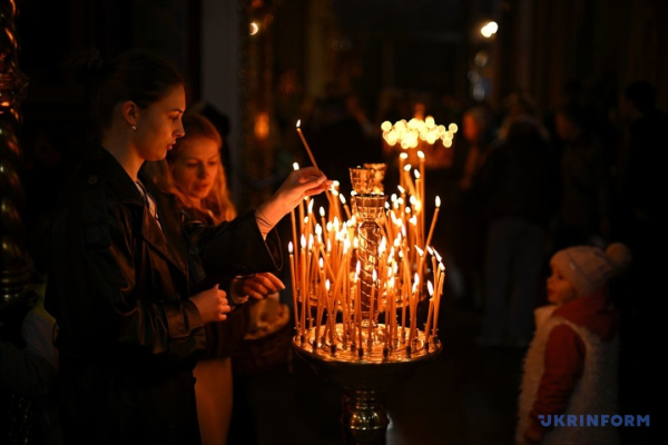 Жінки ставлять свічки у Михайлівському Золотоверхому соборі, біля якого відбулося освячення великодніх кошиків вірян з нагоди світлого свята Воскресіння Христового, Київ, 12 квітня 2026 року.