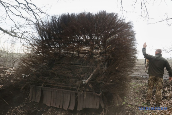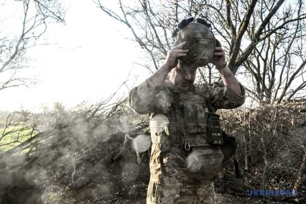Командир гармати, навідник артилерійського розрахунку 260-ї окремої бригади територіальної оборони "Хортиця" Дімір поправляє захисну каску під час виконання бойового завдання за допомогою 152-мм гаубиці Д-20, 9 квітня 2026 року.