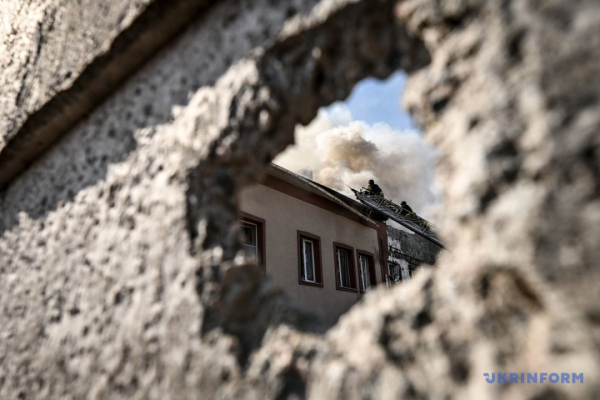 Через діру у стіні видно рятувальників на висувній пожежній драбині, які гасять пожежу, що сталася в офісній будівлі внаслідок влучання російського ударного безпілотника, Запоріжжя, 13 квітня 2026 року.