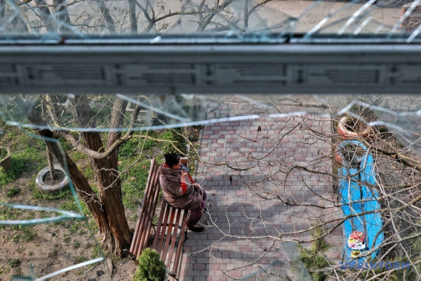 Через розбите скло видно жінку, яка розмовляє по телефону біля житлового багатоквартирного будинку, понівеченого внаслідок російського обстрілу безпілотниками, Одеса, 11 квітня 2026 року.