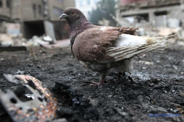Голуб ходить на території гаражного кооперативу, що зазнав серйозних руйнувань унаслідок масованого російського обстрілу Дніпра, 16 квітня 2026 року.