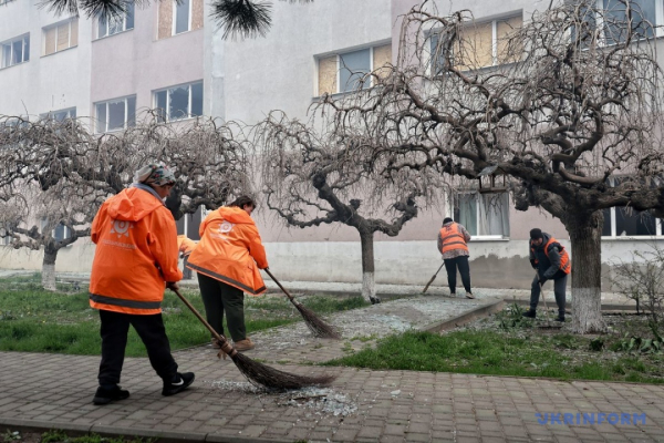 Комунальники підмітають розбите скло під час ліквідації наслідків комбінованої російської атаки на Одесу, 16 квітня 2026 року.