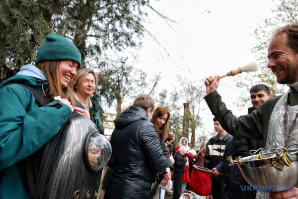 Священнослужитель кропить вірян свяченою водою під час освячення великодніх кошиків з нагоди світлого свята Воскресіння Христового біля Кафедральний собору Різдва Христового в Одесі, 12 квітня 2026 року.
