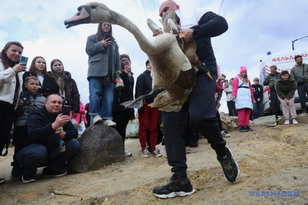 Лебедя випускають на волю під час традиційного випускання врятованих птахів у дику природу, що відбувся у Фельдман Екопарку, Харківська область, 12 квітня 2026 року.