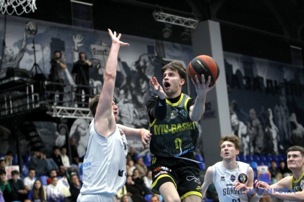 Гравець БК "Київ-Баскет" Михайло Бублик (у центрі) намагається закинути м’яч до кошика під час стартового матчу серії 1/2 фіналу баскетбольної Суперліги GGBET проти БК "Харківські Соколи", що завершився перемогою його команди з рахунком 68:59, Дніпро, 15 квітня 2026 року.