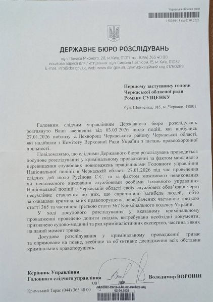 Як ідеться в листі, слідчі ДБР продовжують проводити досудове розслідування у кримінальному провадженні «за фактом можливого перевищення службових повноважень працівниками ГУНП в Черкаській області 27.01.2026 під час проведення слідчих дій щодо Русінова С.С. та за фактом можливого невиконання чи неналежного виконання службовими особами своїх службових обов'язків через несумлінне ставлення до них, що спричинило загибель людей, тобто за ознаками кримінальних правопорушень, передбачених ККУ».