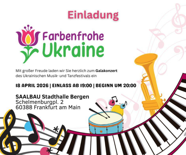 У Франкфурті-на-Майні пройде перший танцювально-музичний фестиваль «Farbenfrohe Ukraine» 17.04.2026 15:27 Укрінформ Перший міжнародний танцювально-музичний фестиваль «Farbenfrohe Ukraine» (Барвиста Україна) пройде в німецькому місті Франкфурт-на-Майні 18 квітня за участі близько 200 виконавців.