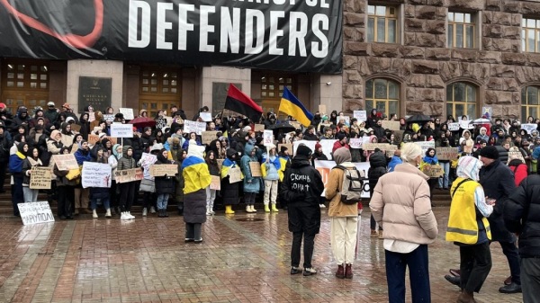 Акція «Гроші на ЗСУ під стінами КМДА в Києві, 3 лютого 2024 р. Фото: Анна Сергієць/Суспільне