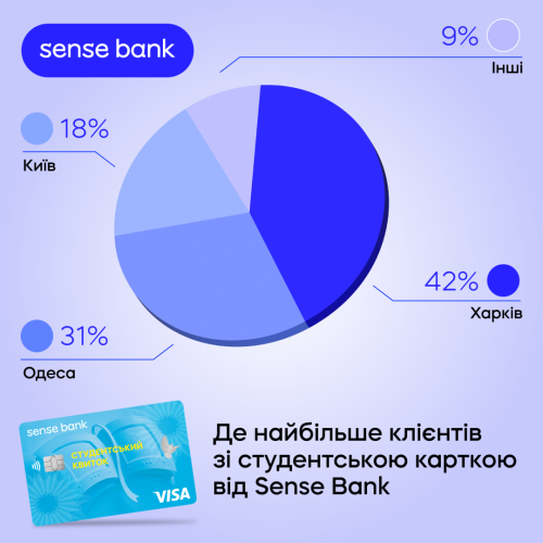 У повідомленні йдеться, що Sense Bank співпрацює з університетами по всій Україні. Серед міст, де представлено найбільше клієнтів зі студентською карткою від банку, — Харків (42%), на другому місці Одеса — 31%, а далі Київ — 18% та інші міста — 9%.