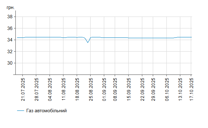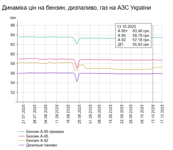 Зокрема, зафіксовано такі середні ціни на пальне: бензин марки А-95 (преміум) – 63,45 грн/л; бензин марки А-95 – 58,74 грн/л (здешевшав на 1 коп.); бензин марки А-92 – 57,25 грн/л; дизельне пальне – 55,89 грн/л (здешевшало на 2 коп.). Середня ціна автогазу становить 34,45 грн/л, що на 1 коп. менше порівняно із попереднім днем.