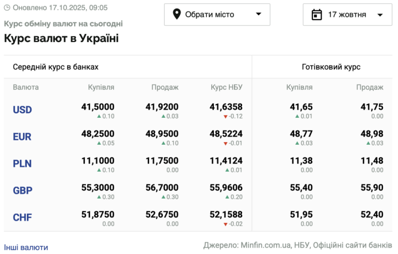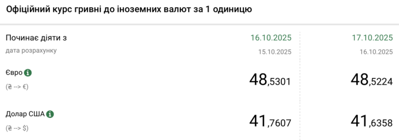 - 1 долар США – 41,63 грн (41,76 грн станом на 16 жовтня);