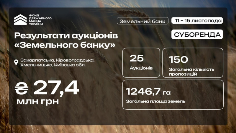 Цього тижня за проєктом «Земельний банк» відбулося 25 аукціонів суборенди державних земель на суму 27,4 млн грн (плюс 5,5 млн грн ПДВ).
