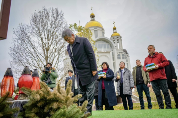 Міністр закордонних справ Японії Такеші Івая, який прибув до України, відвідав меморіал жертвам російської окупації в Бучі та помолився за упокій душ загиблих.