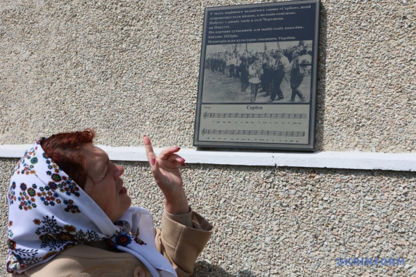 «Відколи себе пам’ятаю, відтоді й про сербен знаю. Ось бачите меморіальну дошку, яку ми зробили у 2023 році, то третій чоловік у танці – мій тато Іван», – розповідає жителька села Чортовець Ореста Гринюк і показує пам’ятний знак на будівлі місцевого храму Пресвятої Трійці УГКЦ (мурована пам’ятка архітектури, зведена у 1790 році, – авт.).
