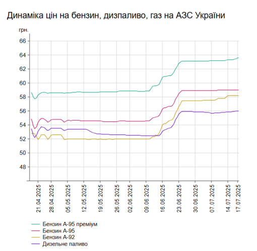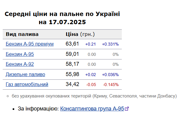 Як повідомлялося, у середу, 16 липня, середня ціна на бензин марки А-95 в Україні зросла на 0,02% до 59,01 грн/л, на дизельне пальне – на 0,12% до 55,96 грн/л.