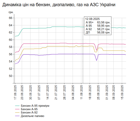 Зокрема, зафіксовано такі середні ціни на пальне: бензин марки А-95 (преміум) – 63,26 грн/л (здешевшав на 4 коп.); бензин марки А-95 – 58,74 грн/л (здешевшав на 3 коп.); бензин марки А-92 – 55,8 грн/л (здешевшав на 19 коп.); дизельне пальне – 55,89 грн/л (здорожчало на 2 коп.). Середня ціна автогазу становить 34,34 грн/л, що на 2 коп. дешевше порівняно із попереднім днем.