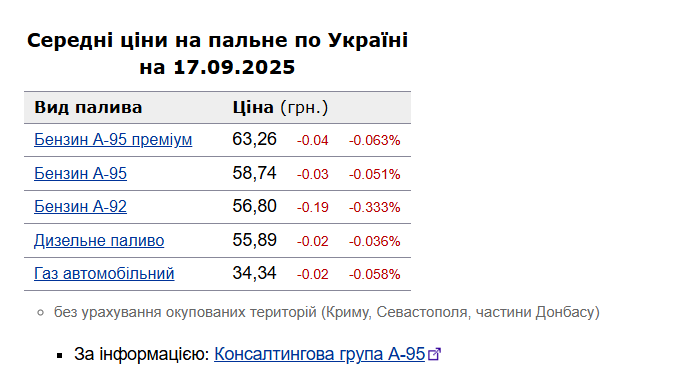 У середу, 17 вересня, середня ціна на бензин марки А-95 знизилася на 3 коп. до 58,74 грн/л, на дизельне пальне – на 2 коп. до 55,89 грн/л.