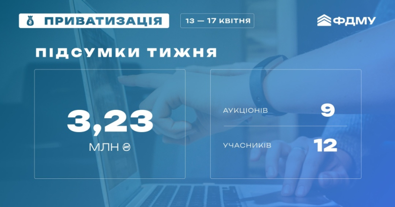 Фонд держмайна минулого тижня залучив 3,2 мільйона від приватизації 20.04.2026 16:44 Укрінформ Фонд державного майна України 13 – 17 квітня провів 9 успішних приватизаційних аукціонів, на яких залучив до бюджету 3,2 млн грн.