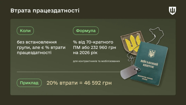"Важливо пам'ятати, що встановлення інвалідності не є остаточною крапкою у питанні виплат. Якщо стан здоров'я погіршиться і групу буде підвищено під час переогляду, закон гарантує право на доплату різниці. Знання цих нюансів та актуальних сум на 2026 рік допомагають військовослужбовцям ефективно контролювати процес призначення допомоги", – зазначили у Міноборони.