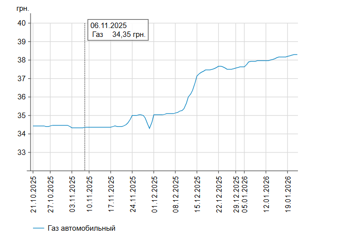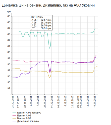 Як повідомлялось, у вівторок, 20 січня, середня ціна на бензин марки А-95 зросла на 40 коп. до 59,47 грн/л, на дизельне пальне – на 32 коп. до 59,19 грн/л.