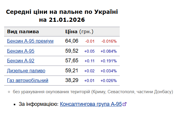 У середу, 21 січня, середня ціна на бензин марки А-95 зросла на 5 коп. до 59,52 грн/л, на дизельне пальне – на 2 коп. до 59,21 грн/л.