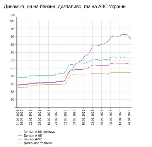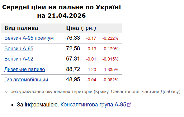 Як повідомлялось, у понеділок, 20 квітня, середня ціна на бензин марки А-95 знизилася на 30 коп. до 72,71 грн/л, на дизельне пальне – на 1 грн 33 коп. до 89,92 грн/л.