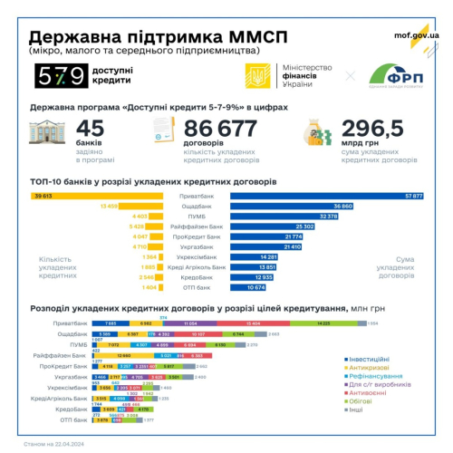 За час дії воєнного стану в Україні видано 51 855 кредитів на 206,9 млрд грн (у тому числі банками державного сектору – 38 756 кредитів на 105,8 млрд грн), з яких станом на 22 квітня поточного року: 17,11 млрд грн – на інвестиційні цілі, 58,55 млрд грн – на фінансування оборотного капіталу, 37,24 млрд грн – кредити для сільськогосподарських товаровиробників, 13,16 млрд грн – на переробку сільськогосподарської продукції, 57,41 млрд грн – на антивоєнні цілі та 10,02 млрд грн – кредитування в зоні високого воєнного ризику.