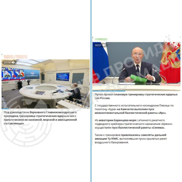Як повідомляв Укрінформ, Росія провела чергові навчання стратегічних ядерних сил. Зокрема, з космодрому «Плесецьк» було запущено міжконтинентальну балістичну ракету «Ярс», здатну нести ядерний заряд, а з атомного підводного човна «Брянськ» — ракету «Синєва». Також здійснили запуски стратегічні бомбардувальники Ту-95МС.