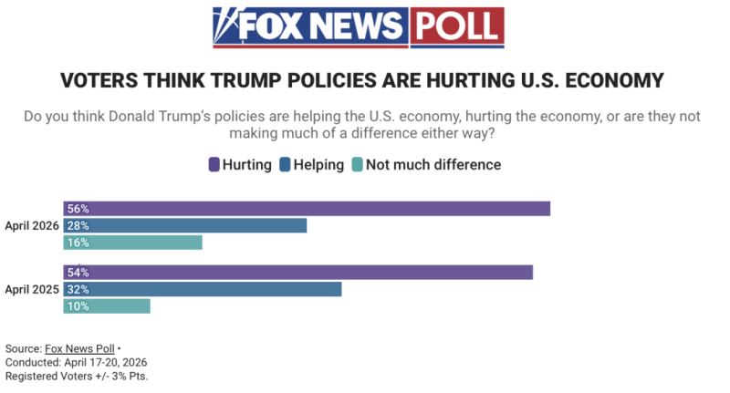 За даними опитування, 56% американців вважають, що політика адміністрації Трампа шкодить економіці країни, тоді як позитивним її вплив вважають лише 28%.