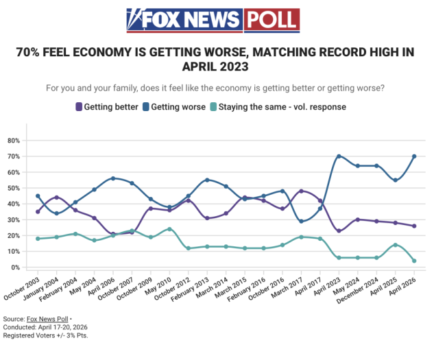 Окрім того, 60% американців негативно оцінюють своє особисте фінансове становище, а 70% кажуть, що відчувають, що економіка країни погіршується – це на 15 пунктів більше порівняно з 55% у квітні минулого року.