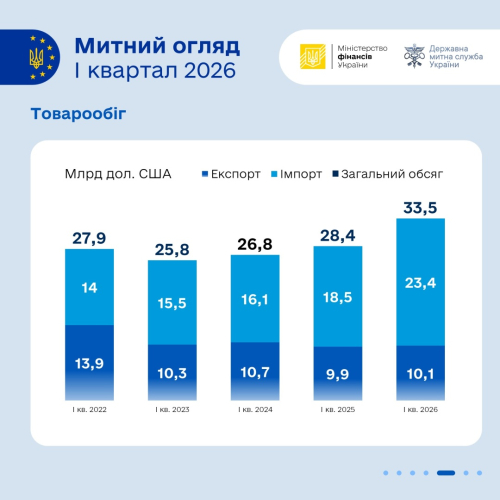 Загальний товарообіг України сягнув 33,5 млрд дол. США, що на 5,1 млрд більше, ніж у першому кварталі 2025 року.
