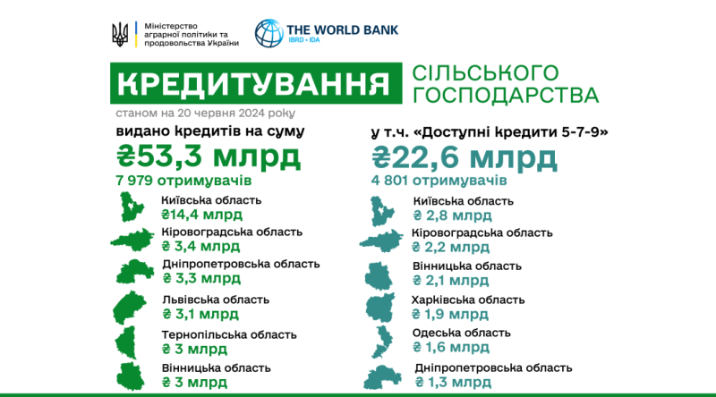 З початку року 7 979 агрогосподарств отримали більше 53,3 млрд гривень банківських кредитів на розвиток, з яких за державною програмою «Доступні кредити 5-7-9» – 4 801 господарство профінансовано на 22,6 млрд грн.