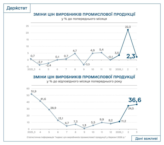 Промислова інфляція в Україні прискорилася до 36,6% – Держстат Графік 24.04.2026 15:38 Укрінформ В Україні у березні 2026 року ціни виробників промислової продукції зросли на 2,3% до попереднього місяця.