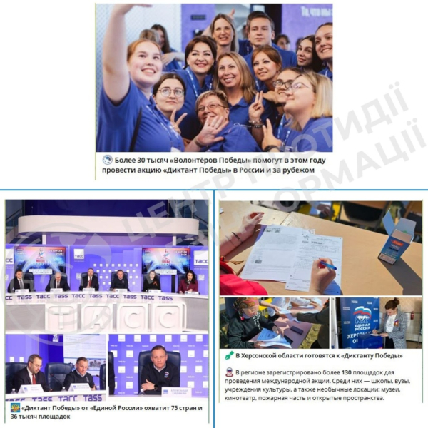 Як зазначають у Центрі, однією з наймасштабніших пропагандистських акцій «побєдобєсія» став «диктант побєди». Медіа РФ хизуються, що цьогоріч диктант стане «рекордним» та охопить не лише навчальні заклади, а «буквально все» – підприємства, установи, вокзали, аеропорти та космодроми.