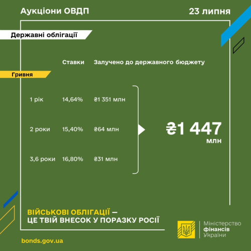Міністерство фінансів України на аукціоні з розміщення облігацій внутрішньої державної позики (ОВДП) залучило до державного бюджету 1,447 млрд грн.