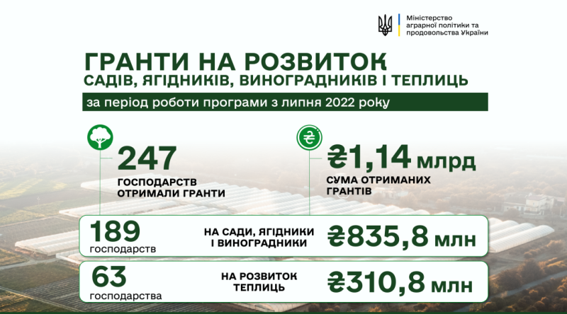У галузевому міністерстві зазначили, що з початку дії програми вже виплачено більш як 1,14 млрд грн грантової допомоги 247 сільгоспвиробникам. З них на розвиток садівництва, ягідництва і виноградарства виплачено 835,8 млн грн 189 господарствам, з яких повністю кошти отримали 171 агрогосподарство.