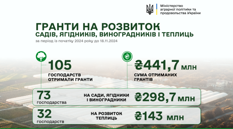Аграрії на розвиток садів і теплиць отримали цьогоріч ₴441,5 мільйона грантової підтримки