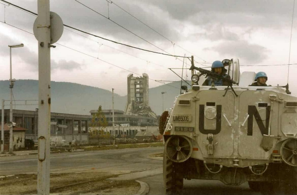 Війська ООН рухаються по «Алеї снайперів» у Сараєво, листопад 1995. (Фото wikipedia)