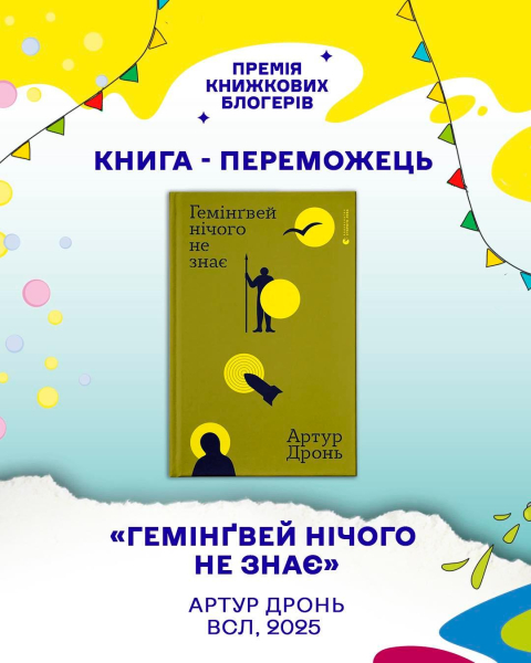Премія книжкових блогерів оголосила переможця 26.04.2026 13:14 Укрінформ Переможцем Премії книжкових блогерів стала книжка "Гемінґвей нічого не знає" письменника і ветерана Артура Дроня.