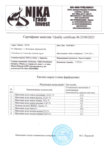 Документи, що отримала організація, засвідчують функціонування сталої схеми постачання каоліну з тимчасово окупованих Росією територій Донецької області. Ключовим постачальником виступає зареєстроване в Донецьку ТОВ «Ніка Трейд Інвест».
