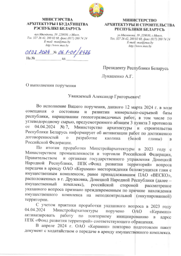 Мінськ не відступив. За підсумками додаткових консультацій з білоруським посольством ухвалено рішення підготувати звернення білоруського уряду до уряду РФ. У листі прямо зазначено: «Робота щодо досягнення домовленостей про розроблення родовища білопальної глини (каоліну) у Російській Федерації Мінбудархітектури буде продовжена».