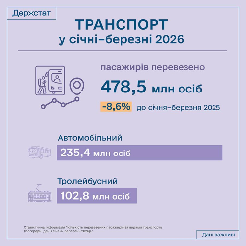 В Україні скоротилися обсяги пасажирських та вантажних перевезень – Держстат 27.04.2026 15:32 Укрінформ У І кварталі 2026 року Україною було перевезено на 8,6% менше пасажирів і на 0,3% – вантажів у порівнянні з аналогічним періодом 2025 року.